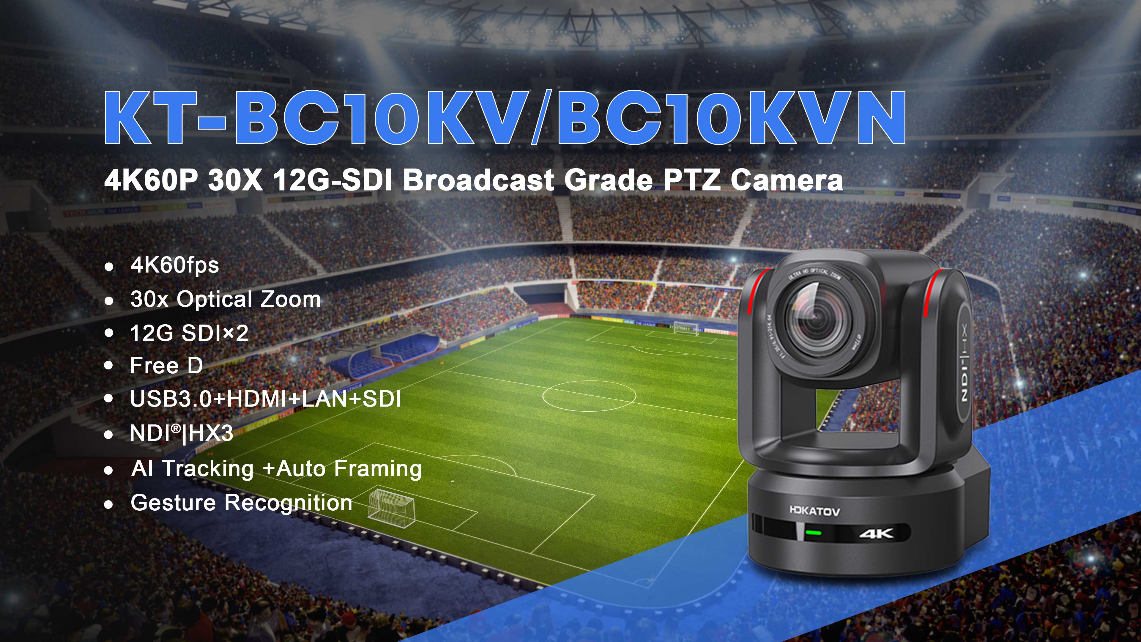 Discover the HDKATOV KT-BC10KV/BC10KVN — a 4K60P broadcast-grade PTZ camera with SONY 1/1.8" CMOS sensor, 30x optical zoom, AI smart tracking, NDI|HX3, and FreeD support. Designed for live broadcasting, virtual studios, and professional production.