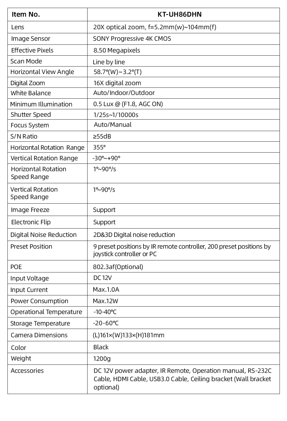 DC 12V power adapter, IR Remote, User manual, USB3.0 Cable, RS-232C Cable, Ceiling bracket, Wall bracket(Optional) |