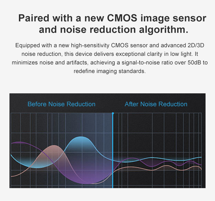 Brand new CMOS image sensor with ultra high S/N Ratio can effectively reduce image noise in low light conditions. Applying 2D&3D Digital noise reduction at the same time, it reduces image noise greatly, even in ultra low light conditions, it could still remain the frame clean and clear, S/N Ratio of the image is higher than 50dB.