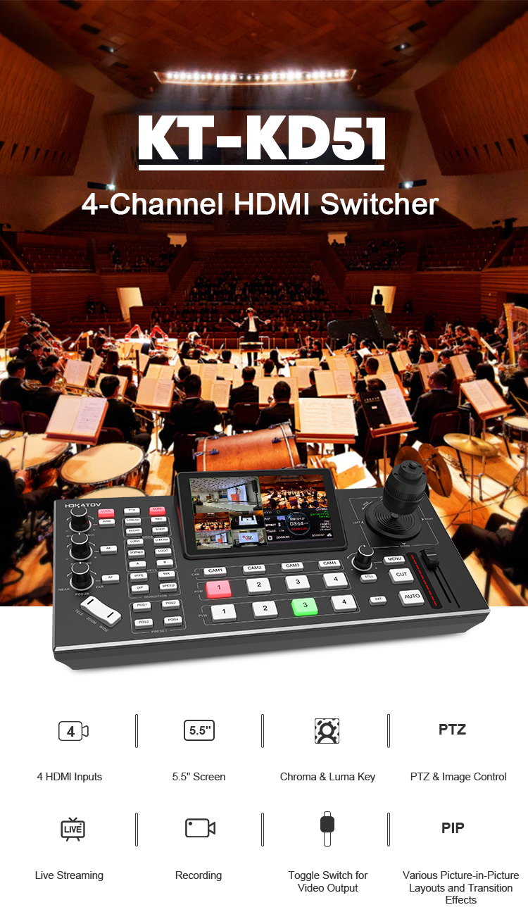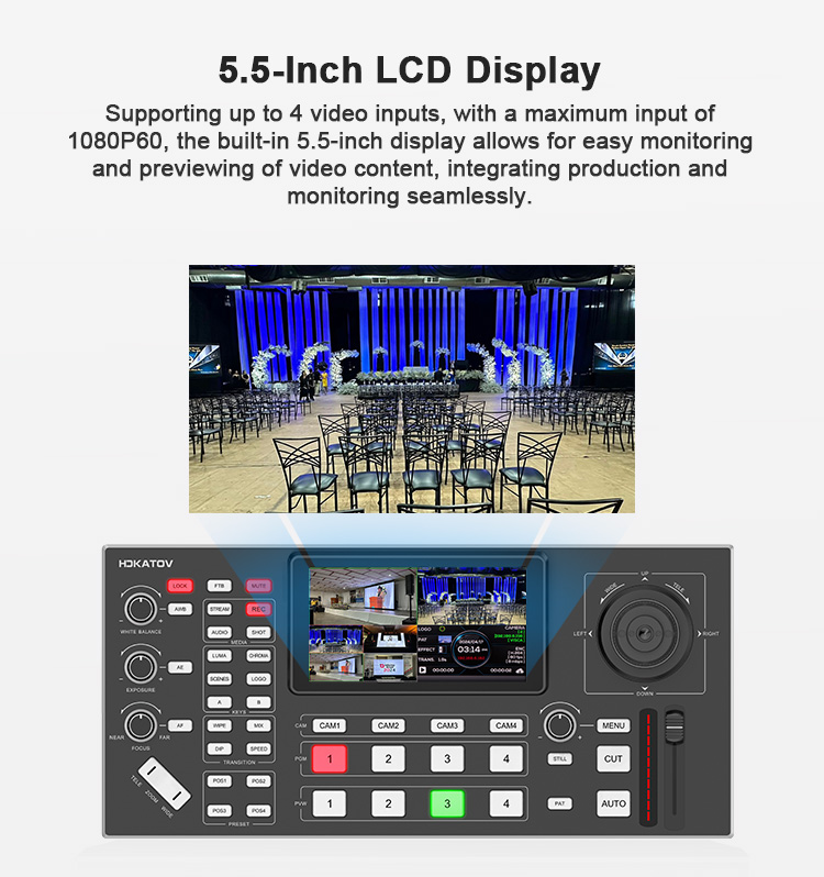 HDKATOV 4 Channels HDMI Video Mixer Switcher With PTZ Camera Control 5.5 Inch Screen Live Streaming Broadcast Switcher